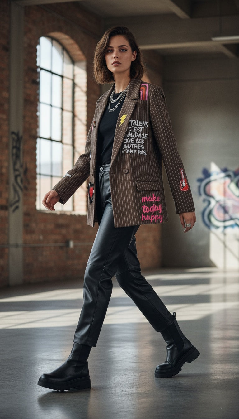 Coupe oversize ou ajustée (selon la version souhaitée) à double boutonnage avec revers de col cranté. Le détail qui fait la différence : une explosion de patchs d'inspiration street-art (cœur, éclair, œil) et de messages statement en contraste.