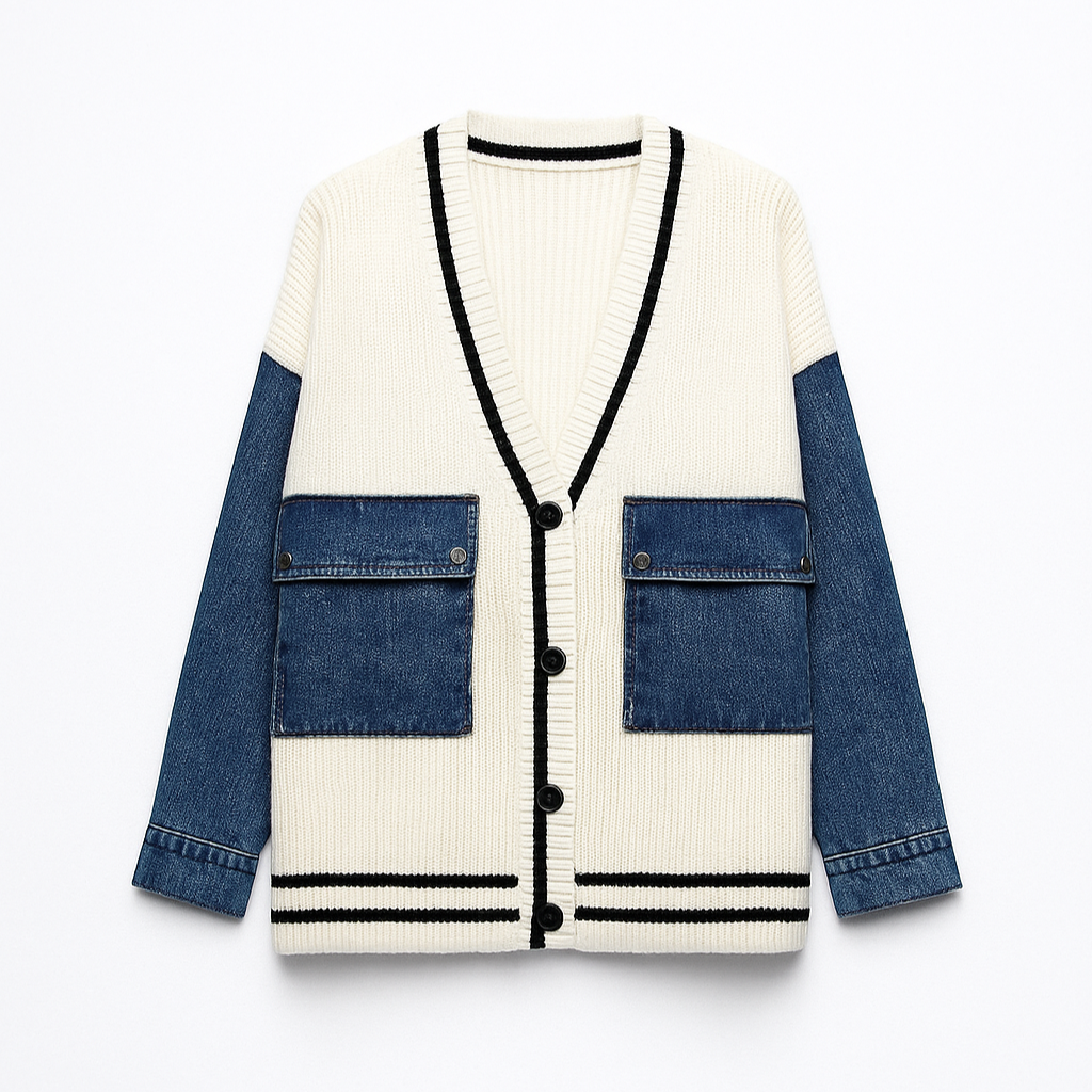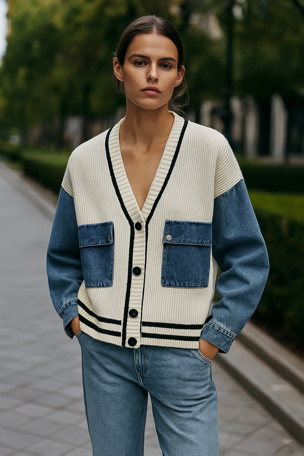 Ce cardigan déstructuré est une pièce forte de la collection. Fabriqué en maille texturée, il se distingue par ses manches et ses poches en denim. Un style audacieux, parfait pour un look à la fois chic et décontracté.