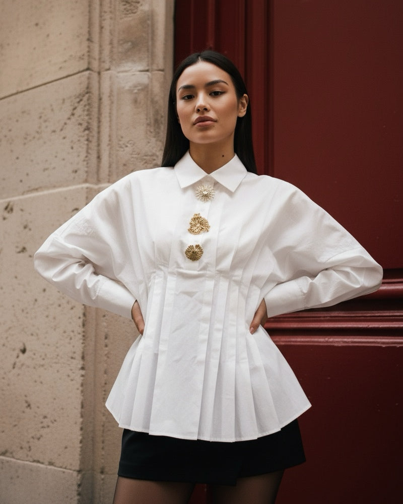 Chemise blanche à la coupe ajustée avec des plis creux sur le devant pour une silhouette structurée. Le col classique et les poignets boutonnés apportent une finition impeccable. Elle se distingue par ses trois gros boutons fantaisie dorés. Parfaite pour un look chic et moderne.