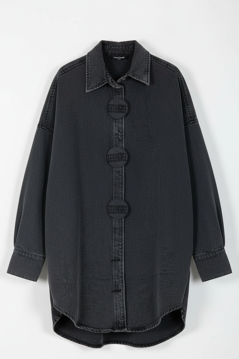 Affirmez votre style avec cette chemise oversize en denim effet délavé gris fumé. Inspirée de l'esthétique workwear revisitée, sa coupe structurée et ample offre un tombé parfait pour un look à la fois décontracté et edgy. Les maxi-boutons décoratifs contrastants apportent une touche de caractère unique. Portez-la fermée comme une veste légère ou ouverte sur un col roulé noir pour un look monochrome chic et contemporain. Un essentiel pour une silhouette affirmée, de jour comme de nuit.