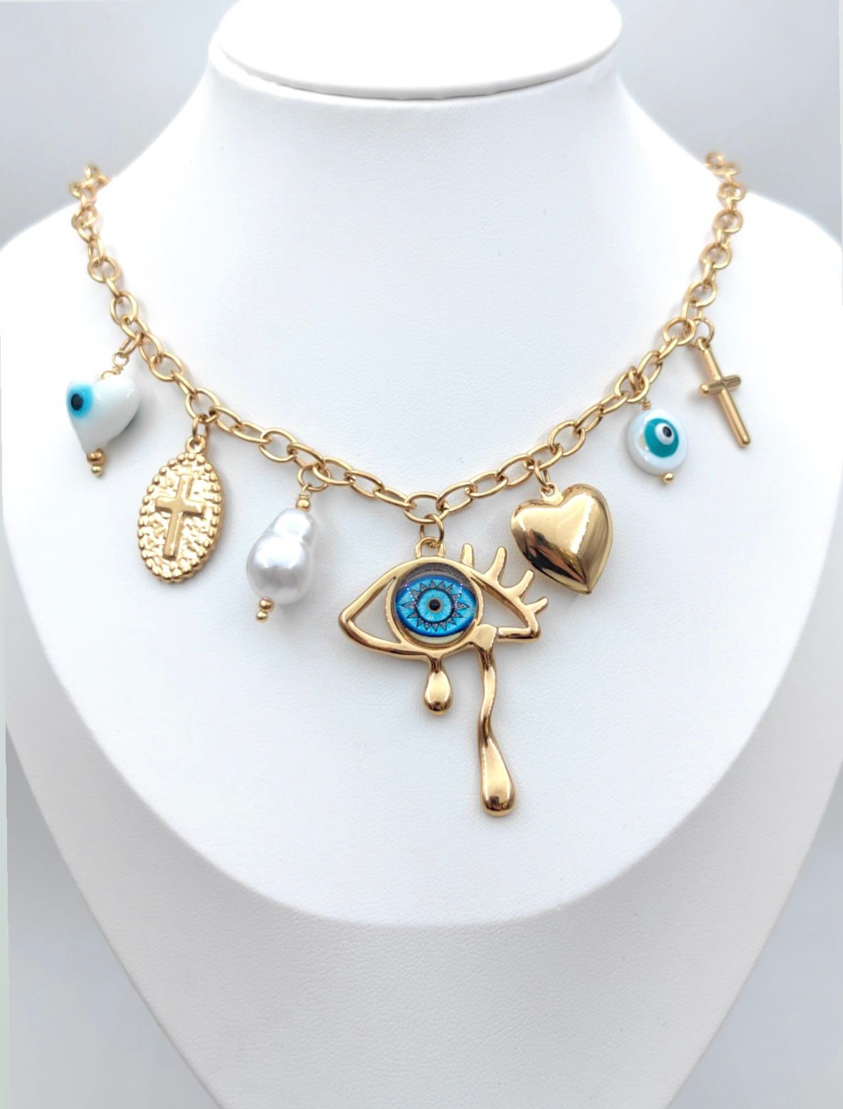 Ce ras-de-cou audacieux en maillons dorés est sublimé par une collection éclectique de charms qui racontent une histoire de mystère et d'élégance.