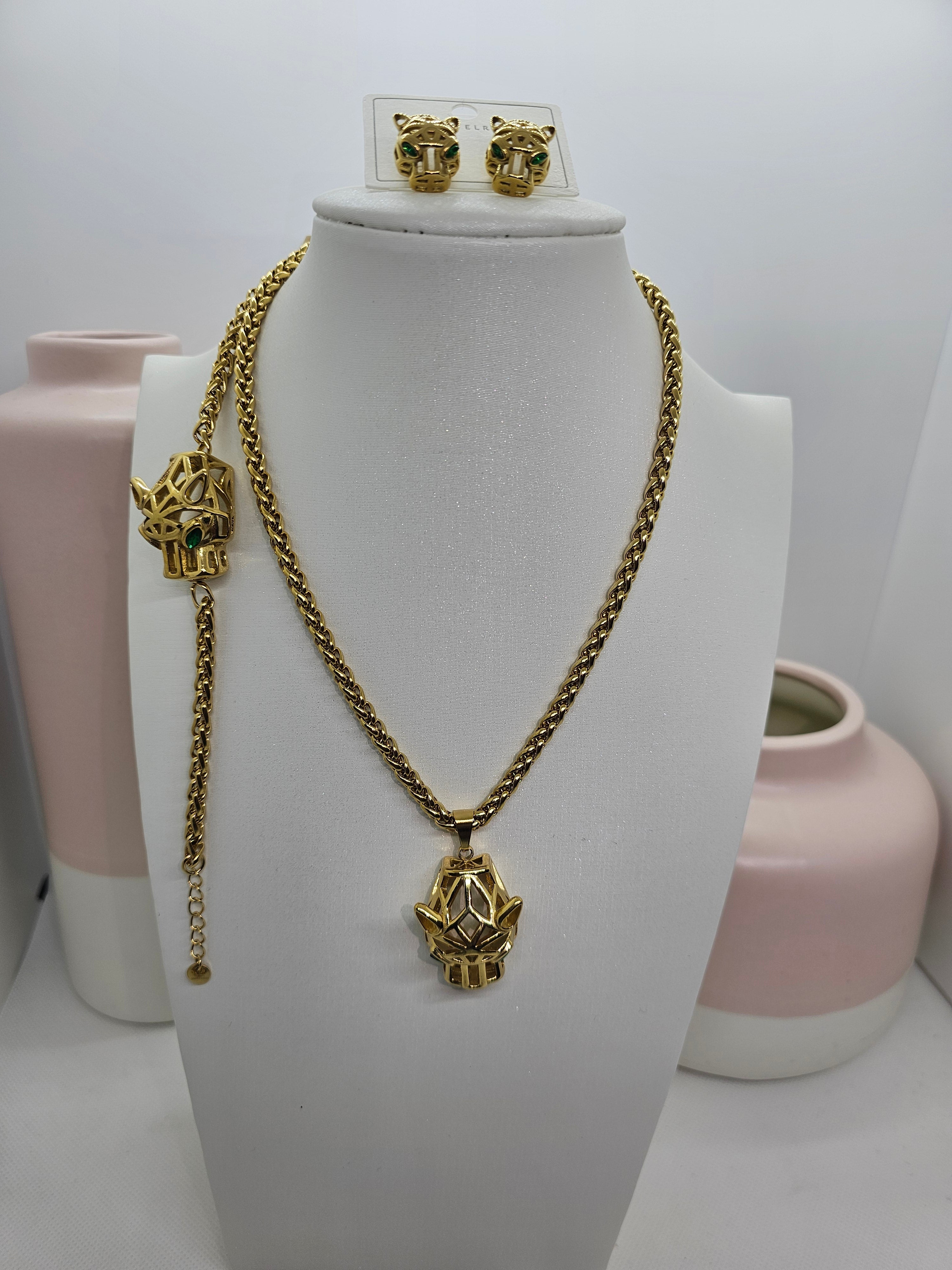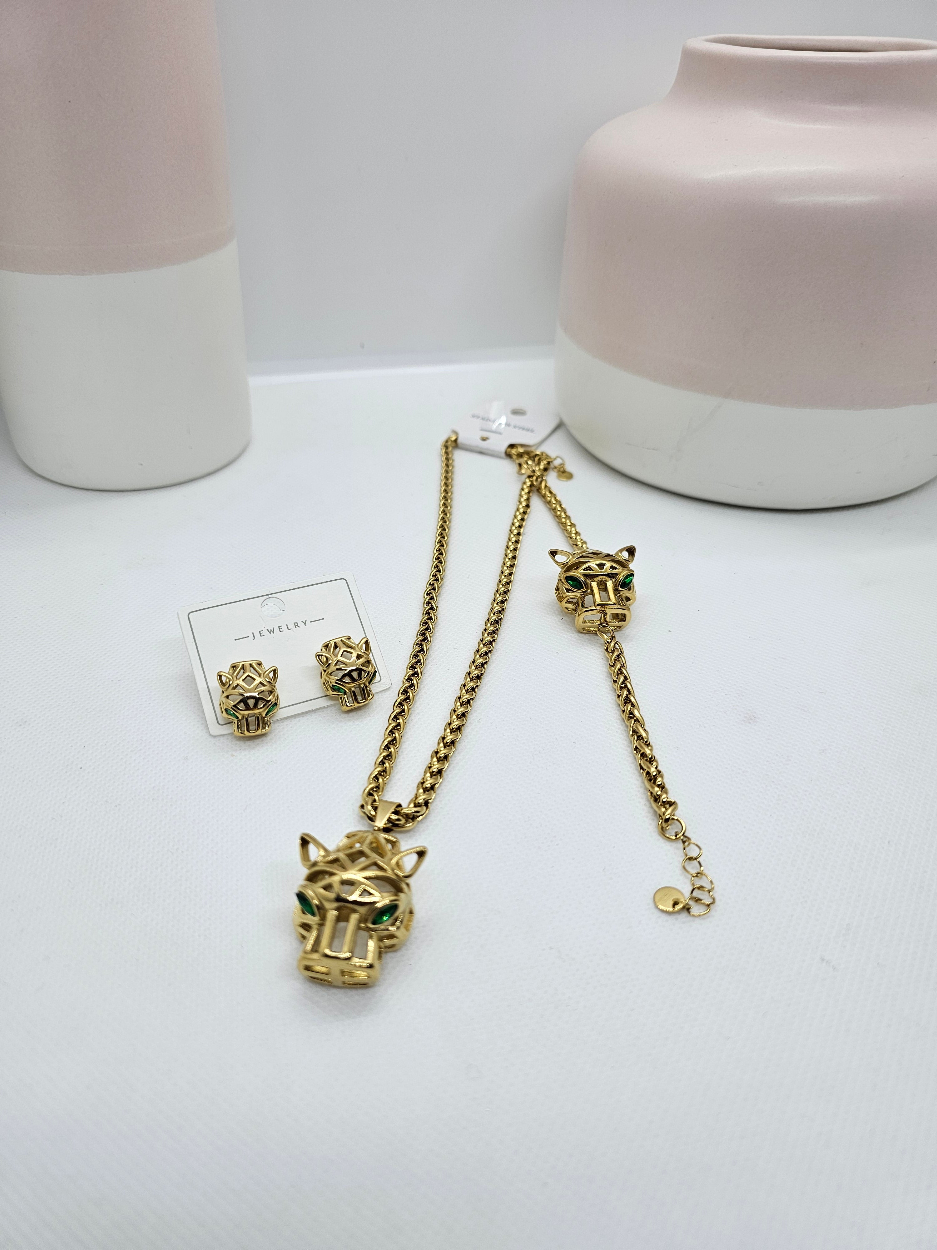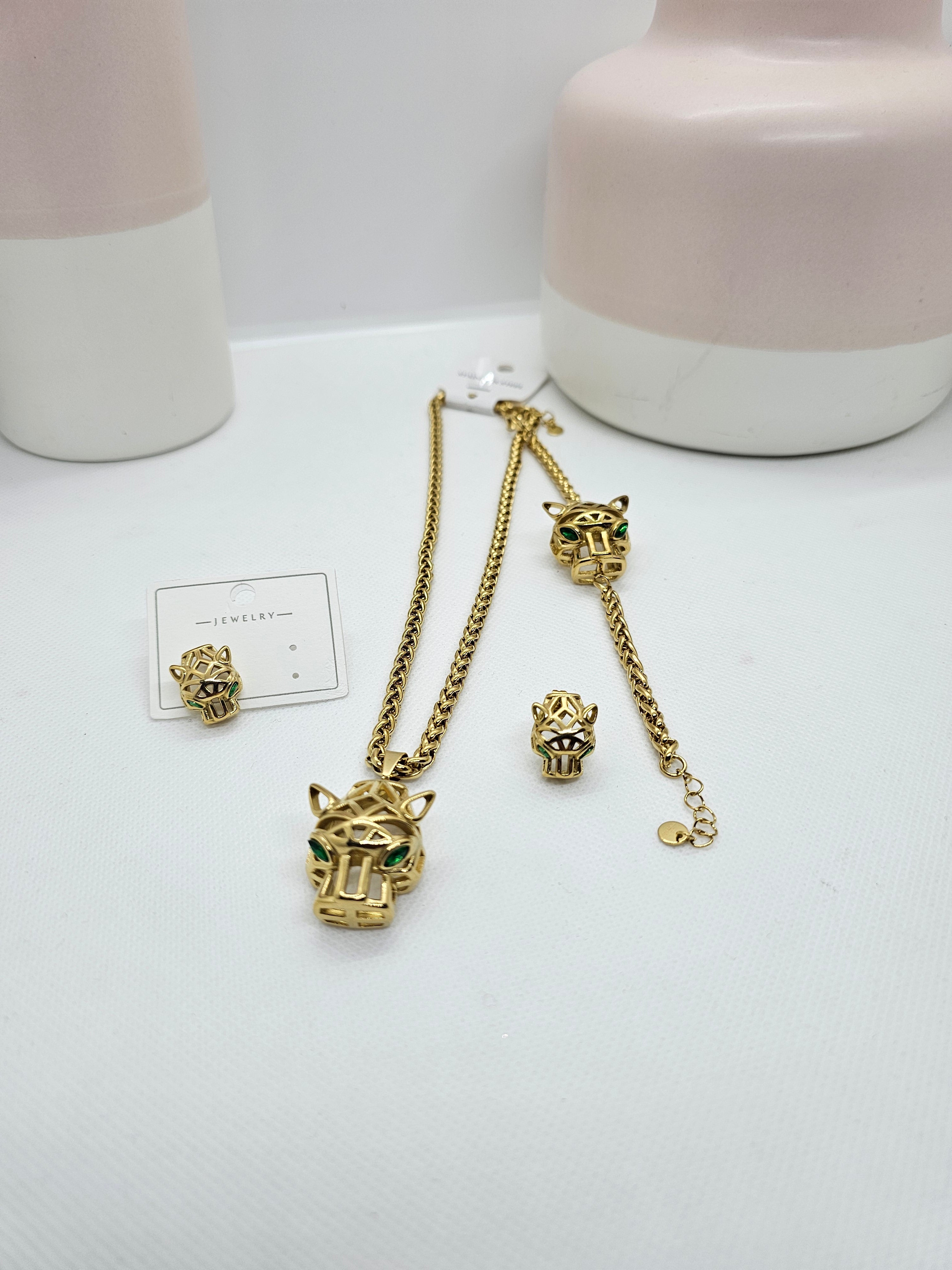 Cette parrure jaguar en acier inoxydable 316L comprend un collier, un bracelet et une paire de boucles d'oreilles. Avec son design élégant et moderne, cette parrure ajoutera une touche de style à toutes vos tenues. Fabriquée avec un matériau durable, elle est parfaite pour toutes les occasions.