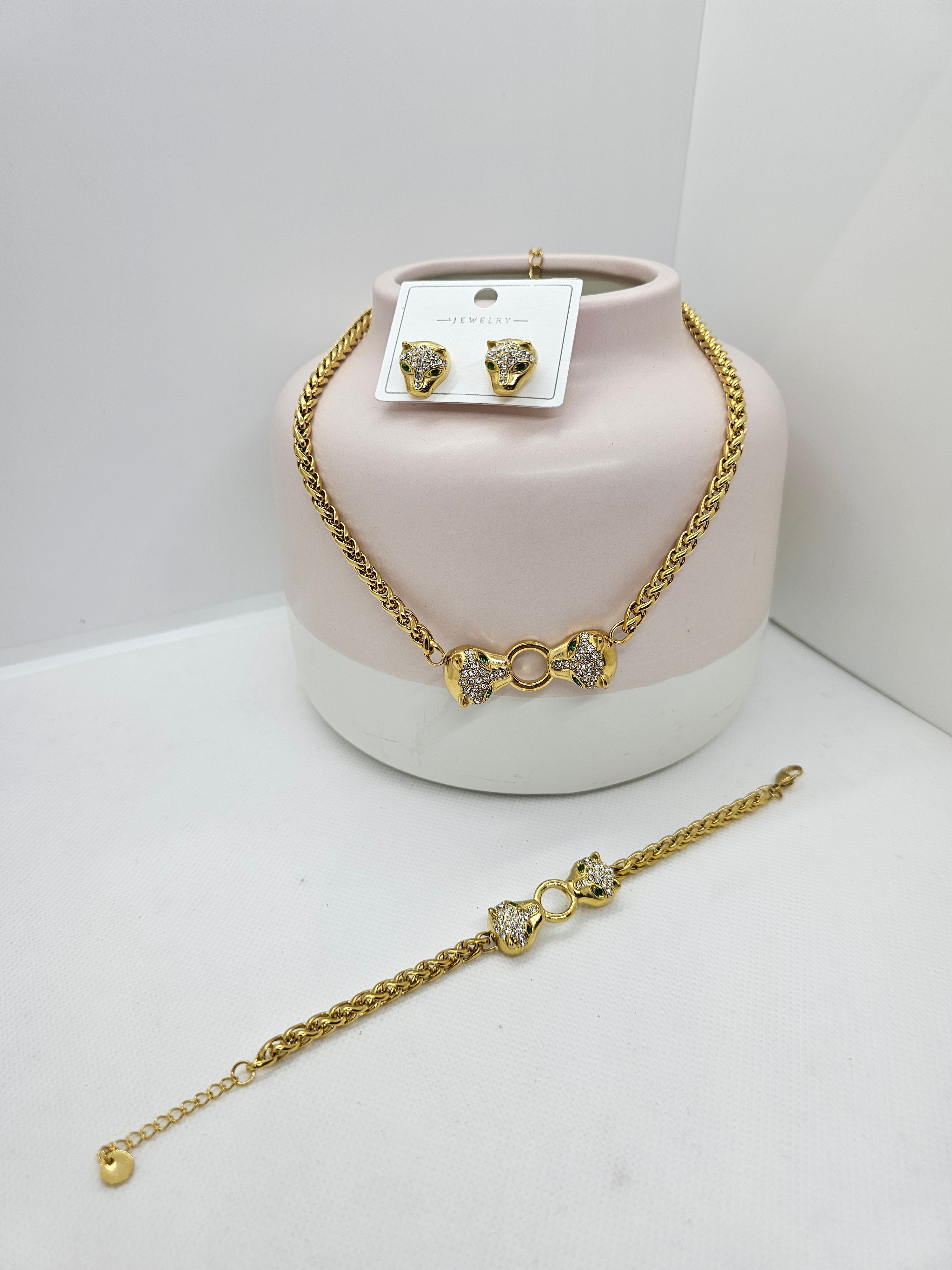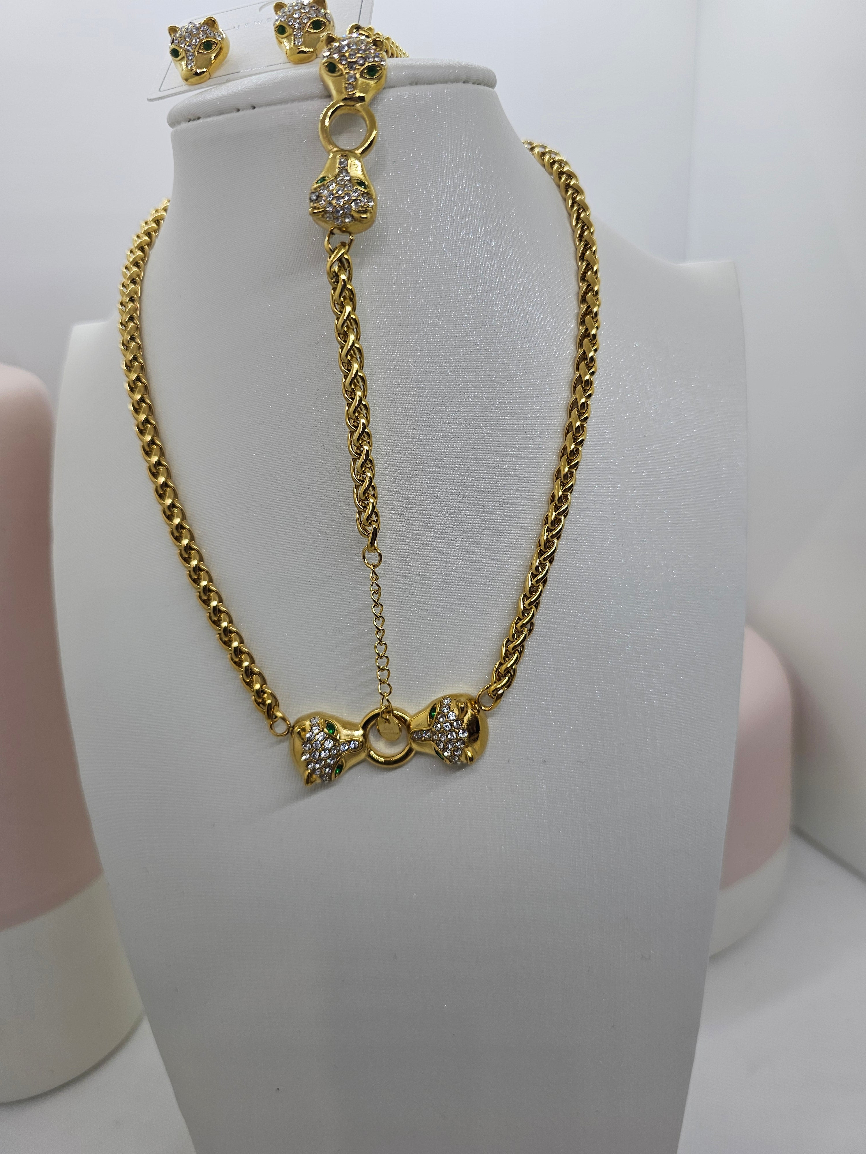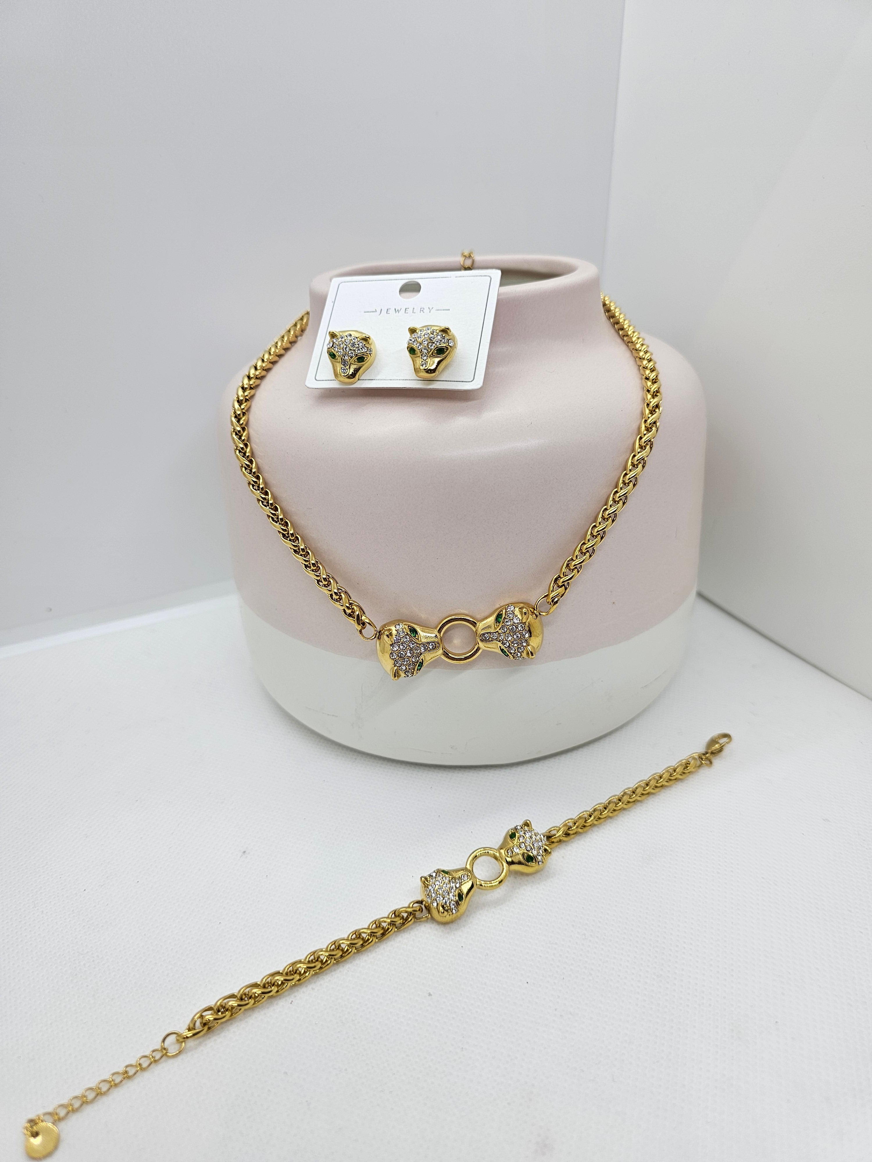 Profitez d'un look élégant et féroce avec cette magnifique parure jaguar en acier inoxydable. Composée d'un collier, d'un bracelet et d'une paire de boucles d'oreilles, cette parure ajoutera une touche sauvage à votre tenue. Fabriquée à partir de matériaux durables, elle est à la fois tendance et résistante. Parfait pour les amateurs d'accessoires uniques.