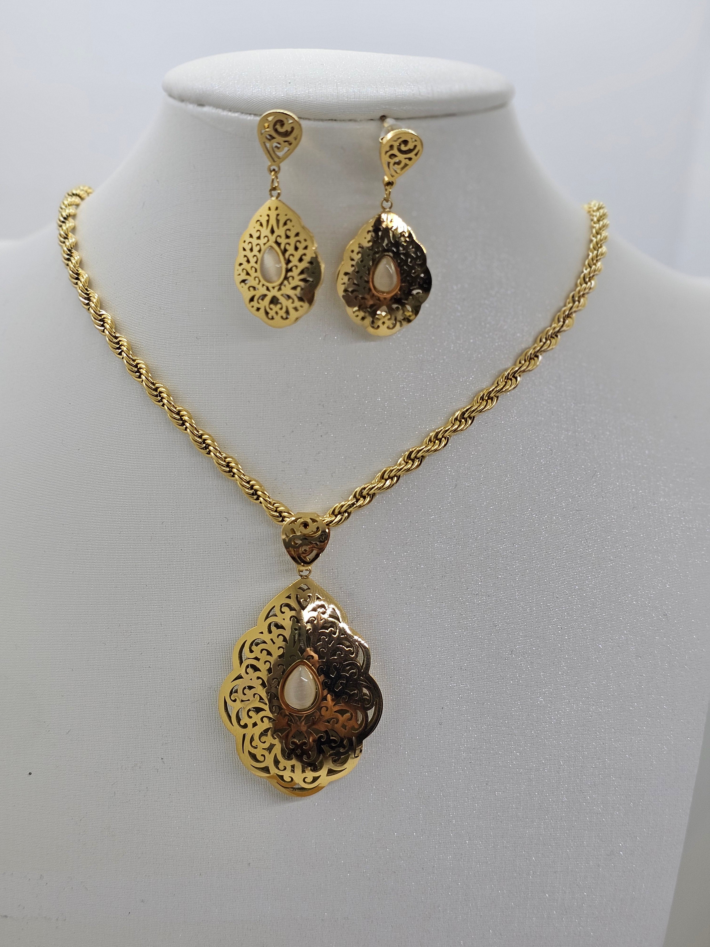 Cet ensemble de bijoux en acier inoxydable est parfait pour compléter n'importe quelle tenue. Il comprend un collier et une paire de boucles d'oreilles ornées de perles blanches. Fabriqué avec des matériaux de qualité, il ajoutera une touche d'élégance à votre look. Un must-have pour toutes les occasions.