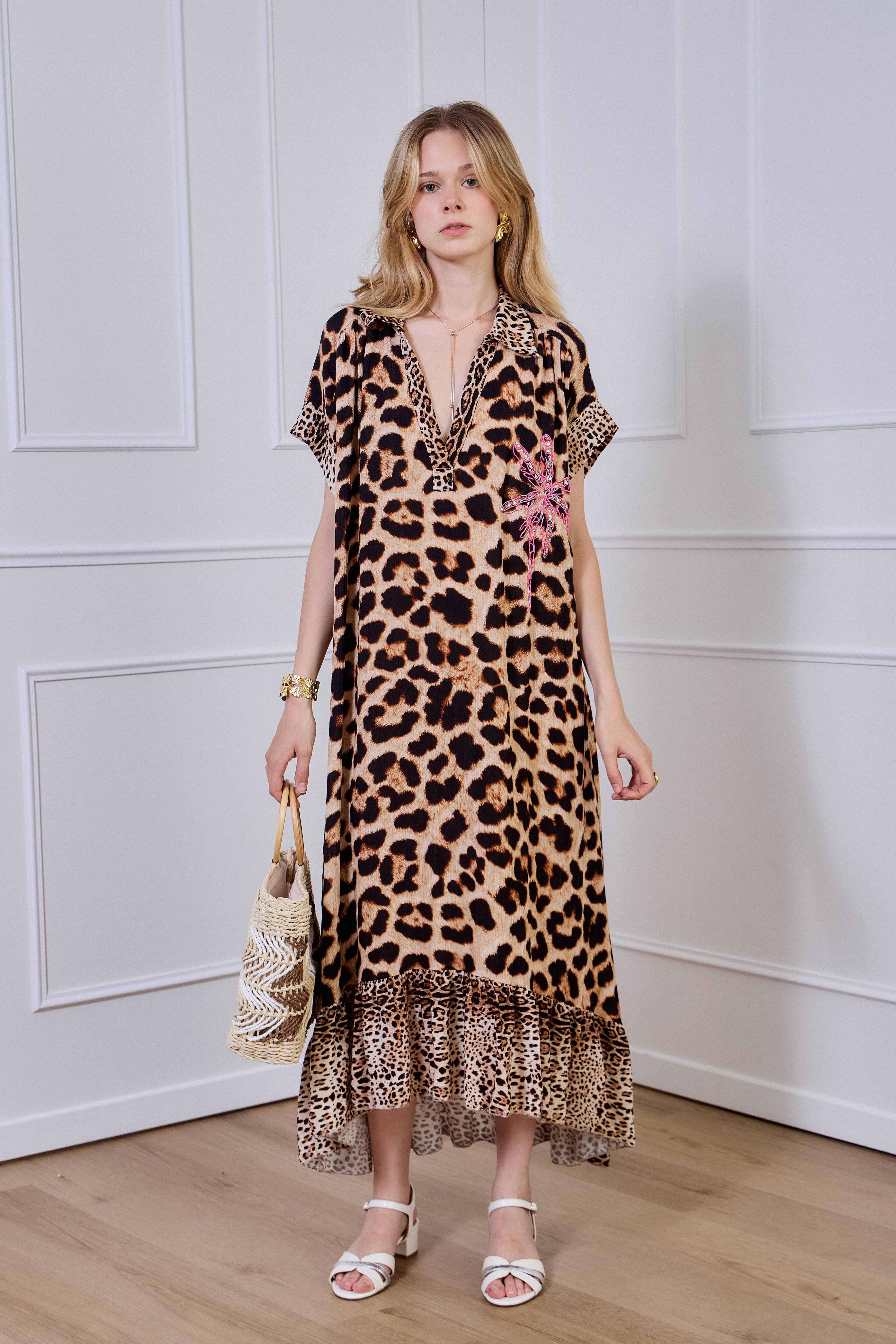 Coupe fluide et légère, tissu légèrement brillant non visible en photo. Motif léopard audacieux, finition volantée en bas, détail brodé rose sur la poitrine. Confort et style sauvage réunis !
