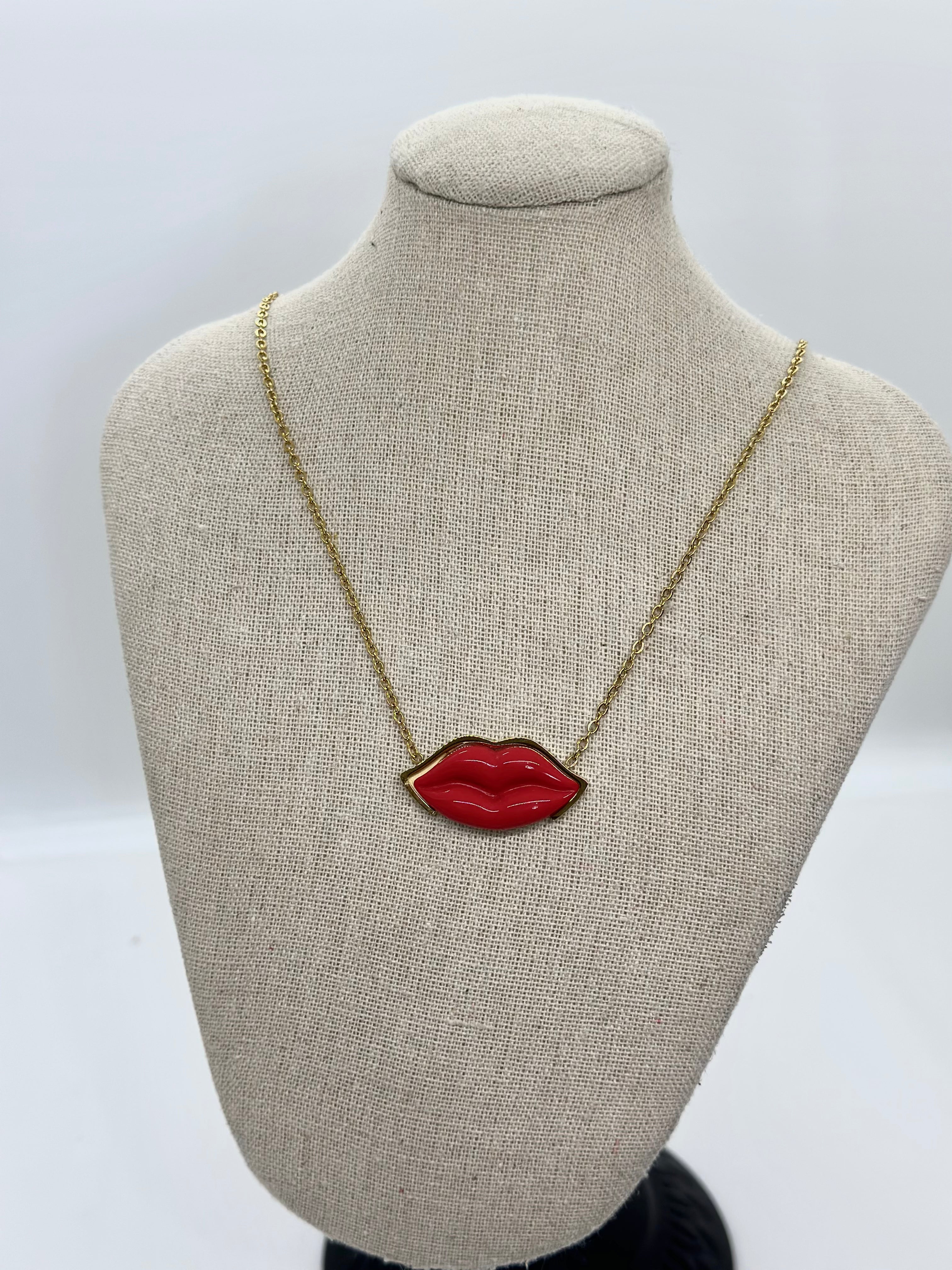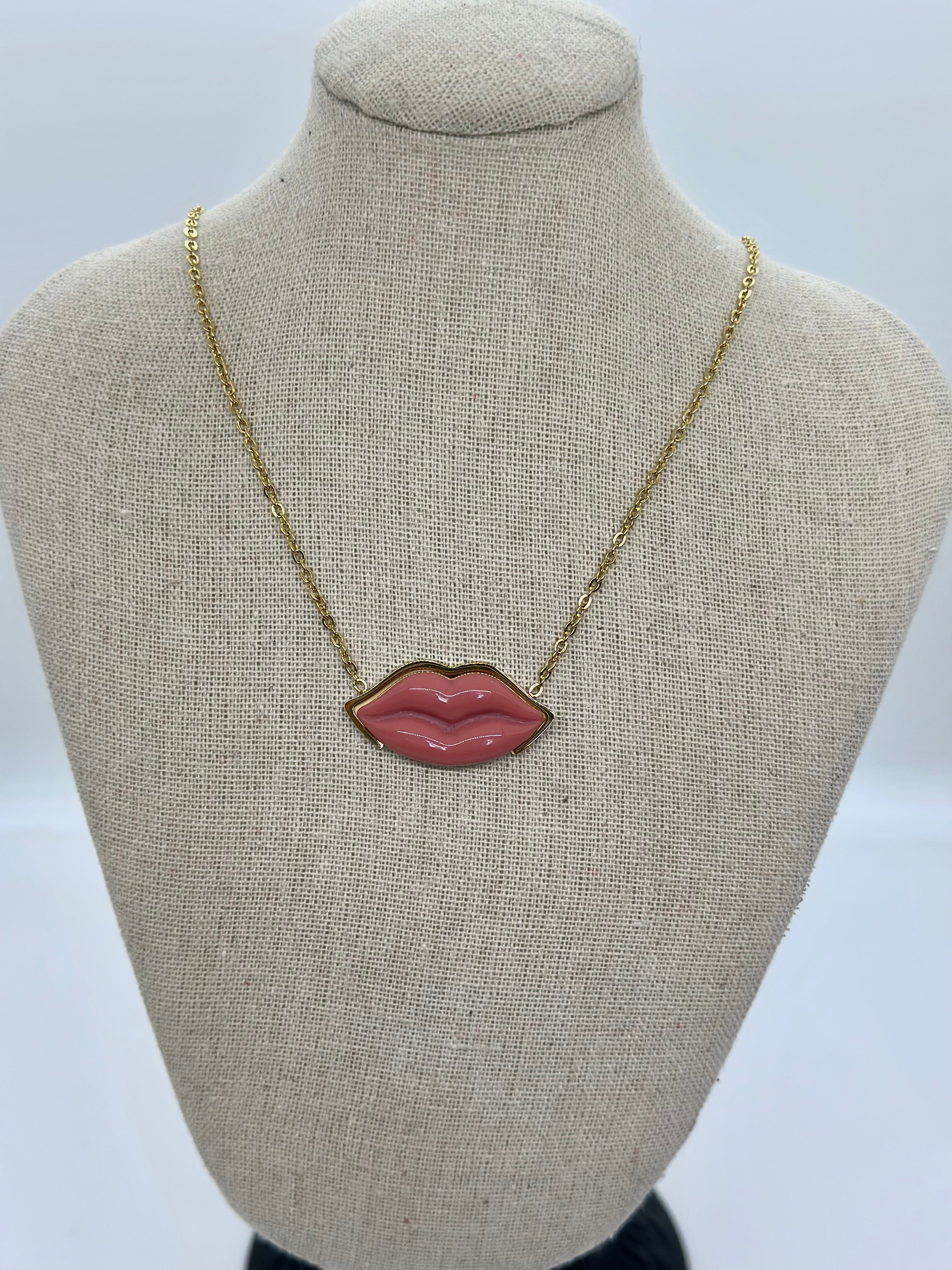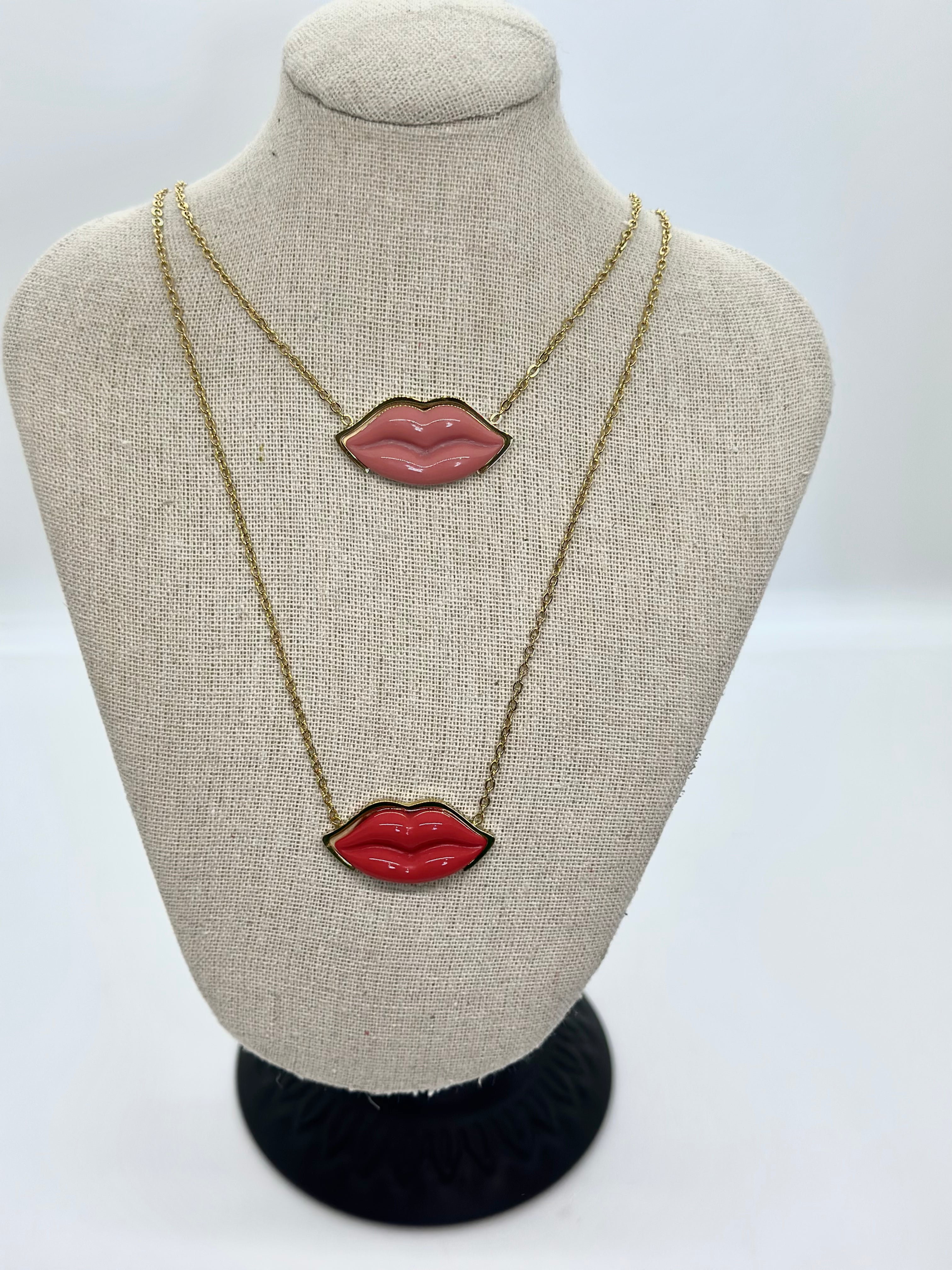 Collier bisou en acier inoxydable disponible en deux couleurs rose nude et rouge