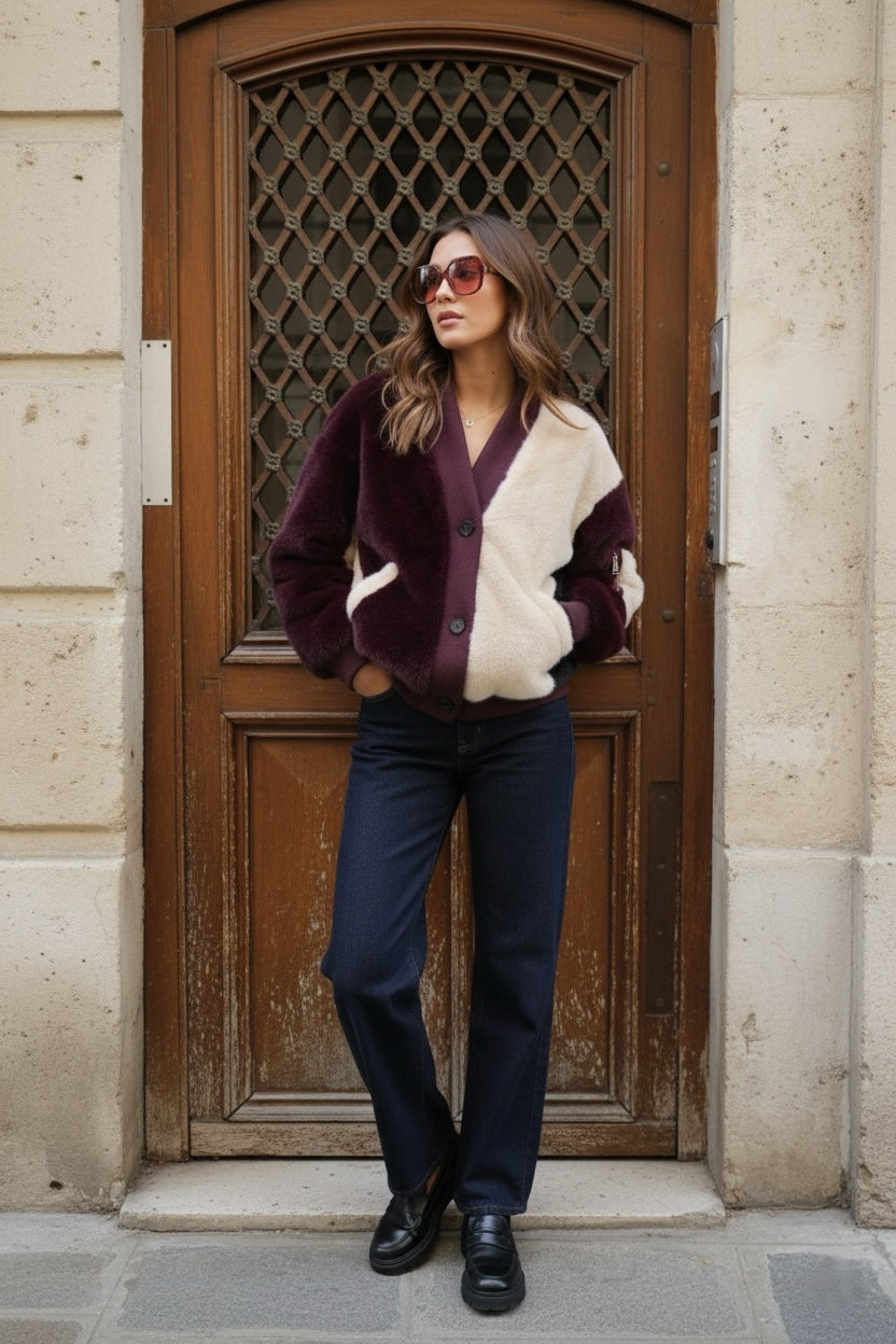 Succombez au confort et au style audacieux de cette veste-cardigan en fausse fourrure bicolore. Sa coupe moderne, légèrement oversize, apporte une touche décontractée et tendance à toutes vos tenues. Le design color block joue sur un contraste riche de couleurs (marron/bordeaux et crème/beige), rehaussé de bords-côtes unis. Fermeture boutonnée classique sur le devant. Parfaite pour une transition de saison ou pour rehausser un look minimaliste.
