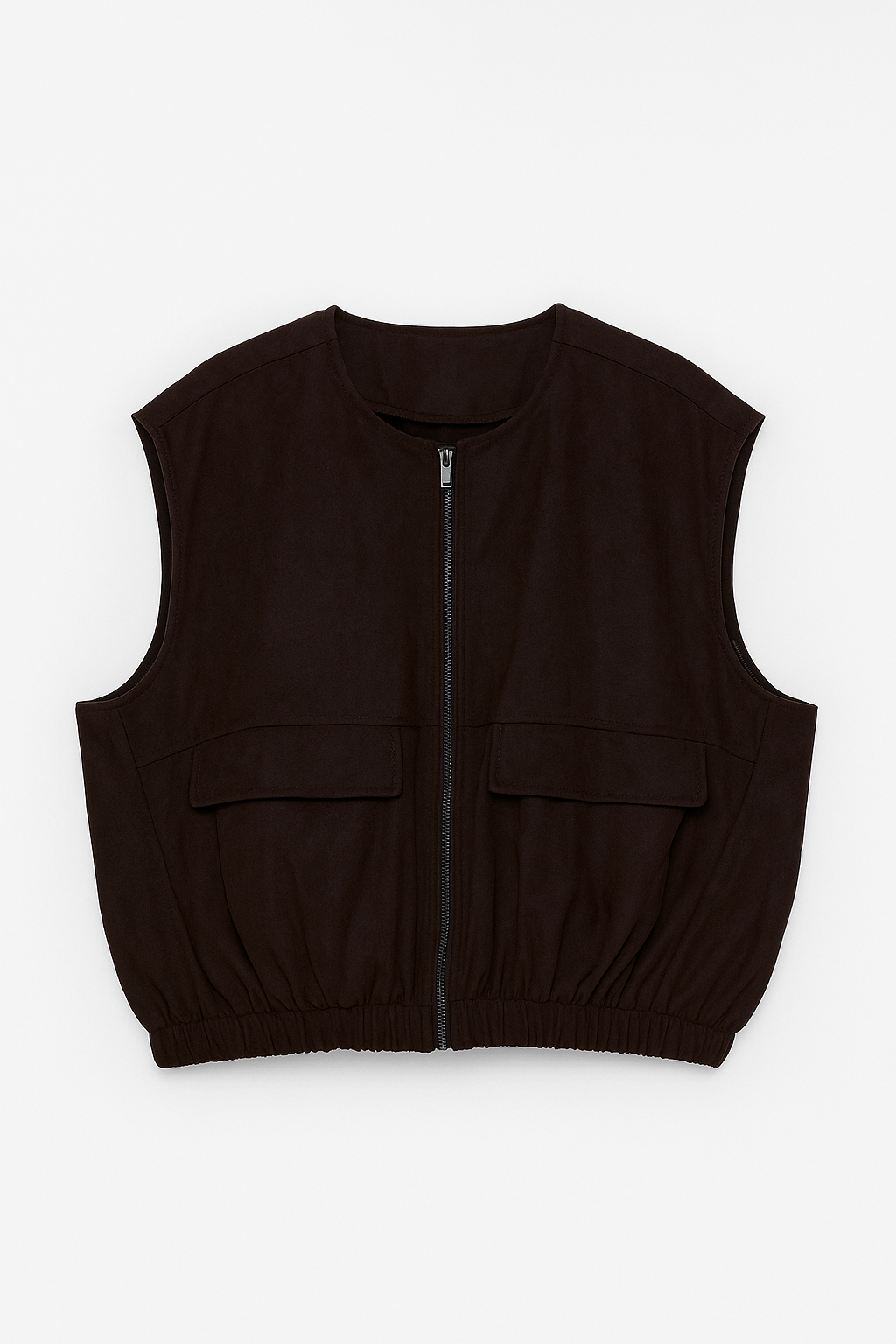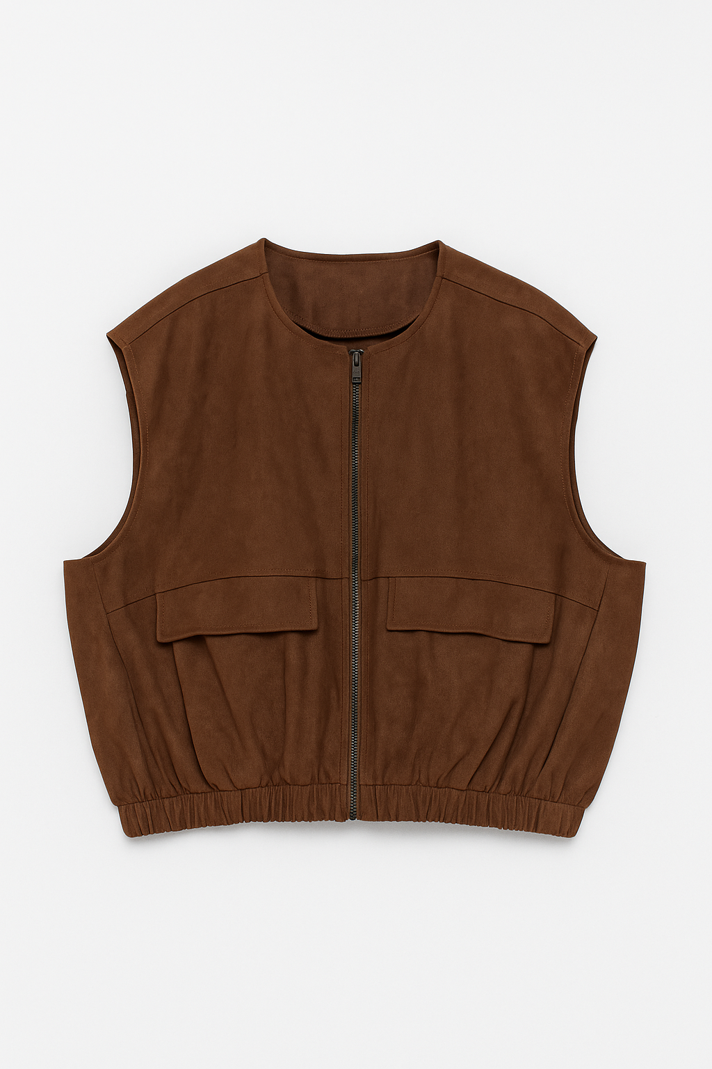 Cette veste courte et ample est conçue dans une matière effet suédine douce, offrant une texture luxueuse et un style décontracté. Elle présente un col rond et se ferme par une fermeture éclair métallique sur le devant. Deux grandes poches plaquées avec rabat et coutures apparentes se trouvent de chaque côté, ajoutant une touche utilitaire chic. La base est dotée d'un élastique froncé qui crée une silhouette structurée et ajustée. Parfaite pour superposer et ajouter une touche de caractère à n'importe quelle tenue, cette veste est idéale pour une allure à la fois moderne et vintage.